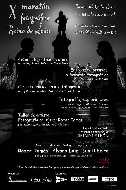El X Maratón fotográfico Reino de León, organizado por la Asociación FOCUS y la Concejalía de Acción y Promoción Cultural del Ayuntamiento de León, inicia el 4 de octubre con su evento principal, el maratón, el programa de actividades que durante tres meses tendrán como eje el Palacio del Conde Luna. Y este año debido a la situación provocada por la Covid-19 propone, bajo el lema ‘Fotografía urbana o de calle’, tomar el pulso a la ciudad mediante instantáneas que reflejen la forma de vivir en estos días, las nuevas costumbres, o simplemente congelar el instante que cada fotógrafo estime oportuno.