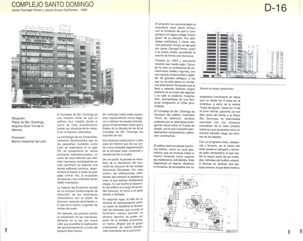 El Día Mundial de la Arquitectura, creado por la Unión Internacional de Arquitectos en 1985, cobra forma, por octavo año consecutivo, con la colocación de 36 placas informativas DOCOMOMO, con las que se alcanza un total de 304 placas desde 2012. Todas están localizadas en edificios paradigmáticos de la arquitectura moderna del siglo XX, incluidos en los Registros DOCOMOMO Ibérico. Es el caso del Complejo de Santo Domingo, de 1968, en pleno centro urbano de la ciudad, obra de los arquitectos Javier Carvajal Ferrer y Jesús Arroyo Quiñones. Un edificio notable desde el punto de vista arquitectónico, pero nefasto en el aspecto urbanístico, hermano del edificio madrileño ‘Torre de Valencia’, también polémico por su aparatosa emergencia visual sobre la Puerta de Alcalá, con el que comparte planteamientos compositivos y definición constructiva.
