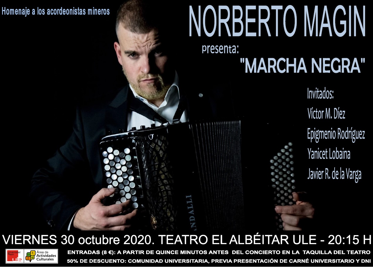 El acordeón está sin duda muy enraizado en las cuencas mineras leonesas, y eso lo sabe muy bien Norberto Magín, todo un referente de este instrumento en la comarca de Babia, que antaño tanto encandiló a reyes y nobles. Y por ello este viernes 30 de octubre el escenario del Teatro El Albéitar da cabida al espectáculo ‘Marcha Negra’, el título de su primer trabajo discográfico en solitario, y todo un homenaje a la magia que destila. El concierto, con aforo reducido, comenzará a las 20:15 horas, y contará también con la participación de Víctor M. Díez, Epigmenio Rodríguez, Yanicet Lobaina y Javier R. de la Varga.