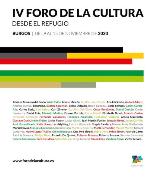 Bajo el lema ‘Desde el refugio’, el Foro de la Cultura celebrará del 9 al 15 de noviembre de 2020 la que es ya su cuarta edición en Burgos. Alternando modalidades on line y off line, el IV Foro de la Cultura ha programado distintos debates entre humanistas y expertos de diferentes ámbitos con un hilo común: el cambio climático y el medio ambiente, en su impacto y consecuencias sobre el planeta Tierra, los seres vivos que lo habitamos y las esferas públicas y privadas que componen nuestra cotidianidad, entre otras cuestiones.
