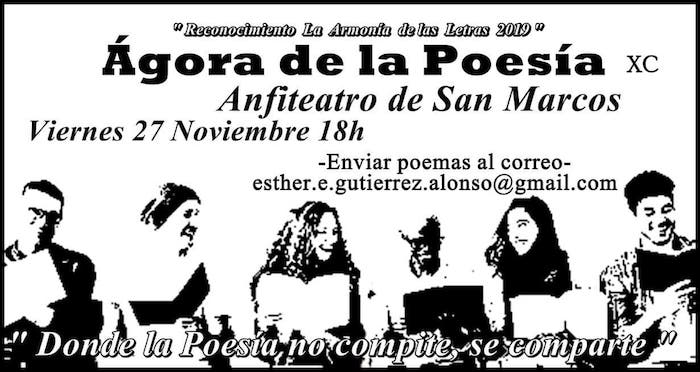 Este viernes 27 de noviembre de 2020 se celebrará una nueva sesión, la XC (90), del Ágora de la Poesía, que desde el año 2013 se viene realizando el último viernes de cada mes en el anfiteatro de la plaza de San Marcos, en León. Por las medidas tomadas por la pandemia de la Covid-19, el recital comenzará a las 18 horas.