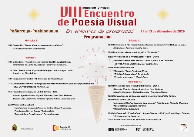 El Encuentro de Poesía Visual además de volver a poner de relevancia la importancia de las artes plásticas, pone el foco en esta octava edición y bajo el epígrafe ‘En entornos de Proximidad’ en la denominada poesía visual, poesía experimental o nou art. Durante tres días, el 11, 12 y 13 de diciembre, un amplio elenco de académicos, expertos, estudiosos e interesados, nacionales e internacionales analizaran la situación de la Poesía Visual, sus contradicciones, y su posición en el ámbito de la cultura. Y lo harán a través de conferencias, veladas, talleres y concursos, que dadas las circunstancias derivadas de la pandemia serán todas online. Participan destacados artistas visuales nacionales e internacionales, entre otros Francisco Aliseda, Alejandro Thornton, Marisa Gioaccini, Raúl Reguera, o Fernando Aguiar, figura clave de la poesía visual portuguesa.
