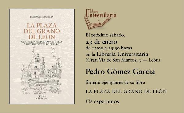 Este sábado 23 de enero, por la mañana, de 12 a 13.30 horas, tendrá lugar la firma del libro “La Plaza del Grano de León. Una visión histórico-artística y una propuesta de futuro” (Eolas Ediciones), del que es autor Pedro Gómez García, en la Librería Universitaria (Gran Vía de San Marcos 3, en León).