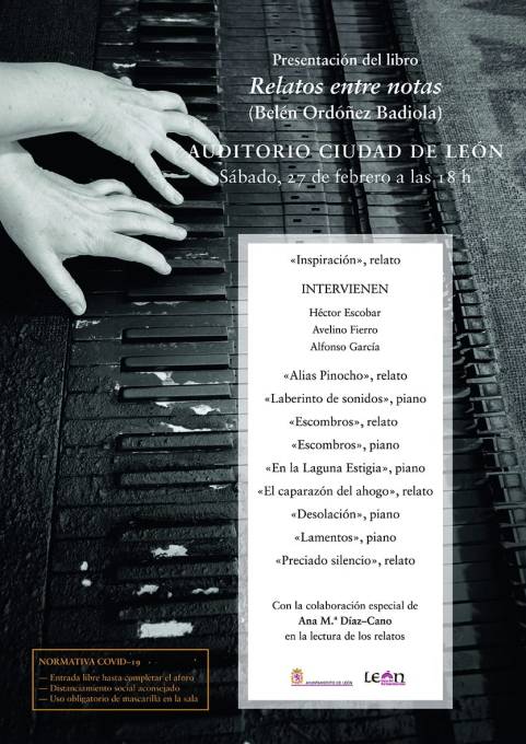 ‘Relatos entre notas’ de la pianista Belén Ordóñez, publicado por Eolas Ediciones, salió del horno recientemente, pero la pandemia ha retrasado su presentación. Finalmente será este sábado 27 de febrero, a las 18:00 horas, en el Auditorio de León. Es su primera incursión en el ámbito literario a la que ha trasladado su pasión por la música y la literatura a través de cuarenta relatos. En la presentación intervendrán Avelino Fierro, Alfonso García y el editor Héctor Escobar. La lectura de los relatos correrá a cargo de Ana María Díaz-Cano.
