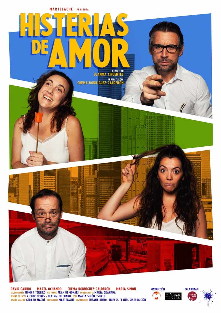 Después del éxito de su último estreno ‘Clásicas envidiosas’, con la que Martelache obtuvo una candidatura a los Premios Max 2016, la compañía repite equipo artístico y técnico. Los actores David Carrio, María Simón, Marta Ochando y Chema Rodríguez Calderón – también autor de la obra- son los encargados de meterse en la piel de los personajes que dan vida a e estas historias de amor cruzadas, personajes que abarcan una gran variedad de arquetipos sociales: parejas heterosexuales, homosexuales, vendedores, trabajadores, parados, ricos, pobres, mujeres y hombres solteros, casados, neuróticos, sociópatas, conocidos y desconocidos. “En una clave de comedia visualizamos el aspecto dramático y cotidiano de las relaciones personales de una manera analítica y, al tiempo, muy humorística”.