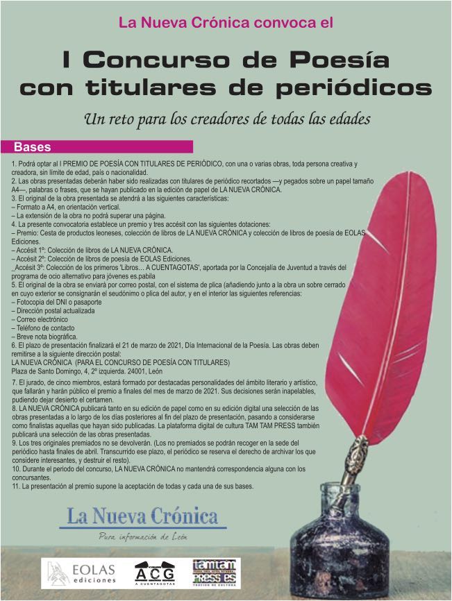 Con motivo del Día Internacional de la Poesía, que se celebrará el 21 de marzo, el diario leonés La Nueva Crónica convoca el I Concurso de Poesía con Titulares de Periódicos, una iniciativa sin precedentes y sin duda original que remite, en el recuerdo, a la exposición de poesía visual del fallecido escritor Tomás Salvador González que se pudo ver hace unos meses en El Albéitar.