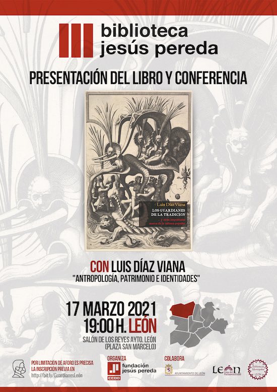 La Fundación Jesús Pereda, en colaboración con el Ayuntamiento de León, presenta el libro “Los guardianes de la tradición” del antropólogo Luis Díaz Viana. La presentación irá acompañada de una conferencia titulada “Antropología, patrimonio e identidades” y tendrá lugar en el Salón de los Reyes del Ayuntamiento de León (Plaza de San Marcelo) el próximo miércoles 17 de marzo, a las 19 horas. Inscripción previa en bit.ly/GuardianesLeón