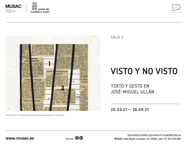 Este sábado 20 de marzo se abrirán al público, en el MUSAC (León), cinco nuevas exposiciones, entre ellas la titulada «Visto y no visto –Texto y gesto en José-Miguel Ullán–». No habrá acto formal de inauguración y la visita del público, que se abrirá a las cinco de la tarde, necesitará inscripción previa en este enlace. A partir del domingo 21, no será ya necesario este requisito y el MUSAC estará abierto en su horario normal. La entrada al museo será gratuita los días 20 y 21 de marzo.