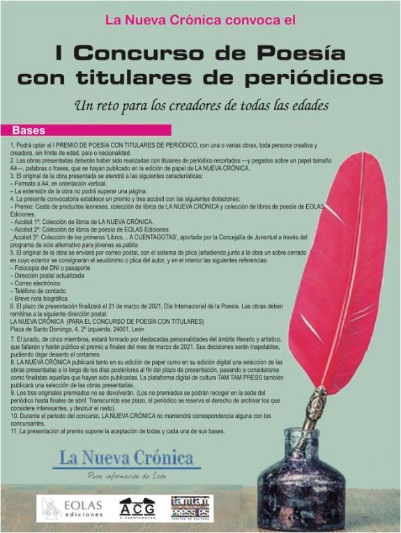 Casi un mes han tenido los poetas para afrontar el reto que se les planteó desde el diario leonés La Nueva Crónica: realizar poesías con titulares que hubieran sido publicados en su edición de papel. El primer Concurso de Poesía hecha con titulares, convocado por este periódico, Tam Tam Press, la editorial Eolas y Libros A cuentagotas ha gozado de una grandísima aceptación. Han sido medio centenar los originales recibidos, procedentes de la provincia de León y de algunos otros rincones de España.