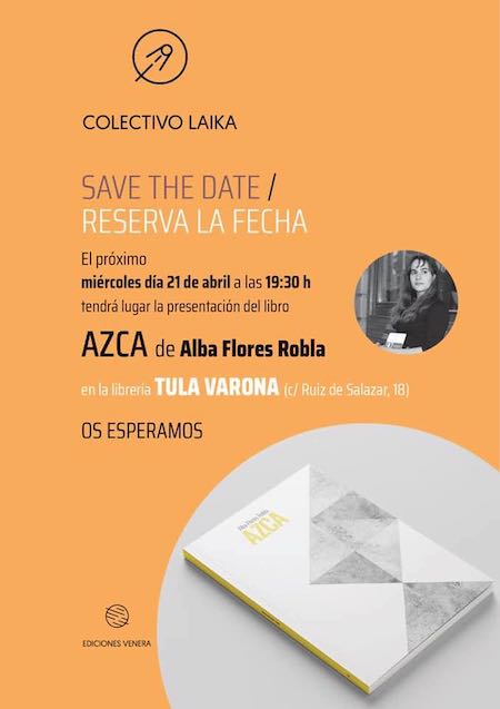 AZCA, el libro con el que Alba Flores Robla ha regresado a la poesía tras ganar con Digan adiós a la muchacha los premios Adonáis 2017 y Ojo Crítico 2018, se presenta este miércoles 21 de abril a las 19:30 horas en la librería leonesa Tula Varona. La autora estará acompañada por el ensayista y traductor Sergio Fernández Martínez, compañero de generación.