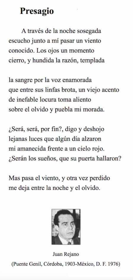 Por otra parte, en el cartel que nos ocupa, las semillas son alegorías que apuntan al renacer y fertilidad de la poesía. También las líneas verticales son alegóricas de una supuesta bandera republicana (Juan Rejano fue republicano y murió republicano). Quiero decir que esas tres líneas de colores evocan a una bandera sin llegar a ser una bandera».