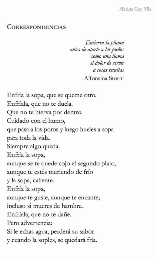 En este libro hay aves en diáspora, como la propia Marina Gay Ylla, a quien su madre siempre llamó «golondrina»; aves que buscan su lugar en el mundo. Y también hay poemas con sus claves secretas, como el titulado «Correspondencias», en el que la sopa no es sino una metáfora del amor entendido como alimento. «Es un poema que habla de amor realmente, de cuando tendemos a enfriarnos y ponemos un muro tan grande que somos incapaces de sentir calor», explica la autora.