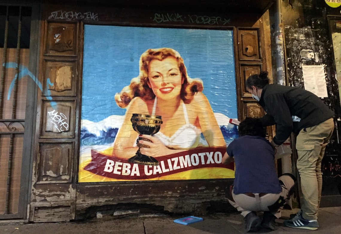 La obra que se ha colocado, como si fuera un anuncio, representa a una sonriente mujer antigua, como de mediados del siglo XX, en bañador, con un fondo de playa falsa y con un gran copón en la mano que bien podría confundirse con el Santo Grial, invitando a beber «CalizMotxo».