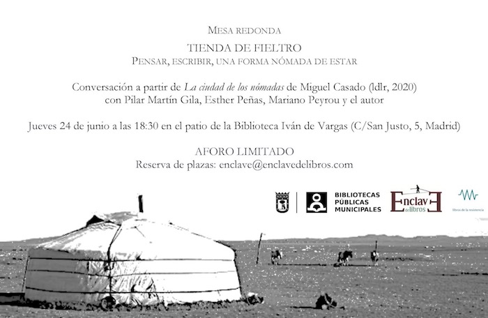 El libro se presentará en Madrid el próximo jueves 24 de junio (18:30 horas) en el patio de la Biblioteca Iván de Vargas (C/San Justo, 5), donde tendrá lugar una mesa redonda titulada «Tienda de fieltro. Pensar, escribir, una forma nómada de estar», en la que Miguel Casado estará acompañado por Pilar Martín Gila, Esther Peñas y Mariano Peyrou. Aforo limitado (reserva de plazas: enclave@enclavedelibros.com)