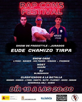 Artistas del espacio urbano leonés feestaylers, activistas de las peleas de gallos, el baile Hip-Hop y breakdance y cantantes locales, se darán cita este viernes y sábado, 18 y 19 de junio, en el II Festival Rap-Cons de Espabila. El escenario elegido es Espacio Vías (León) y la programación cuenta, además de la habitual Batalla de Gallos, con cuatro conciertos a cargo del rapero leonés Dani Morán, el artista canario Nase, y los catalanes 186 y Santa Salut como cabeza de cartel. La entrada, con invitación en: inscripciones.juventud@aytoleon.es