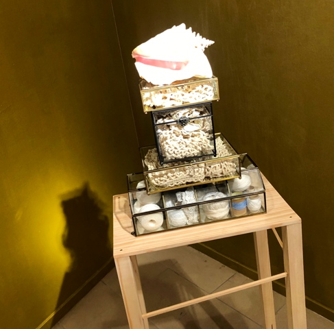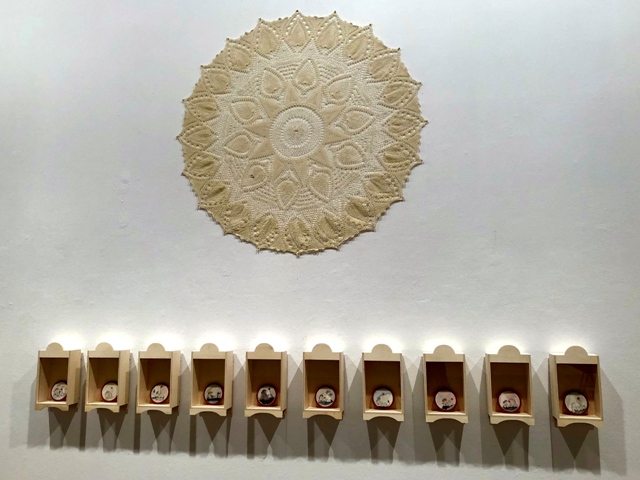 En el segundo espacio se albergan los textiles, los collages y la instalación. Reme Remedios muestra en esta sala cómo a través de las labores de las mujeres de su familia, su madre y su abuela, se va a apropiando de los útiles de costura y de bordado. “En estas piezas incorporo tejidos de ropa que he utilizado o heredado, como dos colchas que eran de mi madre y mi abuela”. Y también es el caso de la instalación ‘Oro’, creada con urnas que contienen hilos y ganchillos. “Todo esto que recibimos sin estar construido es el oro”. Según el comisario de la muestra “la artista funciona como una unidad y también como un colectivo que absorbe el pasado, pero su proyecto es el presente a través de las mujeres con las que participa”.