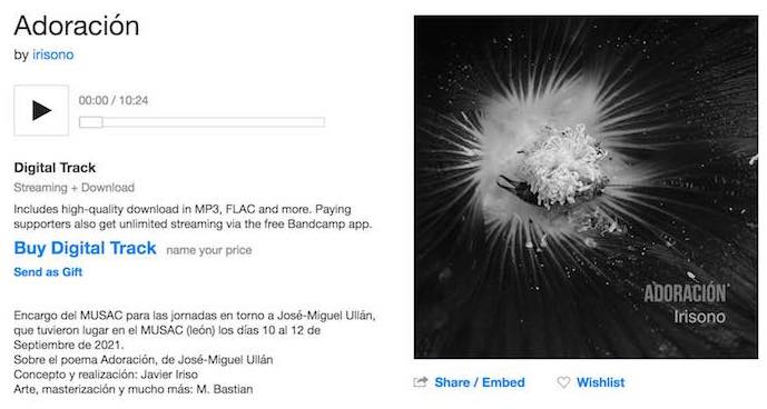‘Adoración’ es una nueva pieza de arte sonoro del compositor y músico leonés Javier Iriso (aka Irísono), compuesta a partir del poema ‘Adoración’, de José-Miguel Ullán, para ser estrenada en las jornadas tituladas «Antología Salvaje» que, con motivo de la exposición “Visto y no visto – Texto y gesto en José-Miguel Ullán”, se celebraron del 10 al 12 de septiembre en el MUSAC (León), conducidas por Víctor M. Díez.