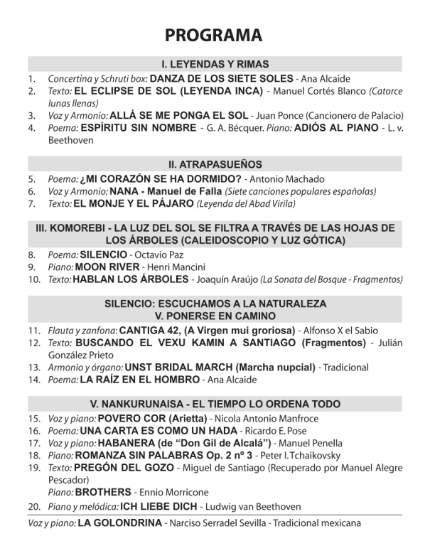 El eclipse es un efecto óptico que solo existe desde la perspectiva de quien lo observa. Es cíclico y momentáneo, no deja huella, y sin embargo puede escucharse; porque, cuando la luz desaparece, los sonidos cobran presencia e intensidad. María Rosa Sánchez Suárez (voz, piano, flauta de pico) y Miguel Ángel Alegre Martínez (piano, zanfona, concertina) se han propuesto recrearlo y se preguntan ¿Sería posible imaginar un eclipse sonoro? “La música se elevaría como arquitectura que alberga la luz; el silencio sería la oscuridad, la lucha del hombre consigo mismo, el deseo de que todo haya cambiado para mejor cuando la luz regrese”.