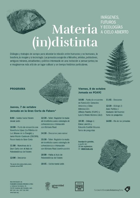 ‘Materia (in)distinta. Imágenes, futuros y ecologías a cielo abierto’ es el título de las jornadas que la Fundación Cerezales ha programado en colaboración con la Universidad de León para abordar la relación entre humanos y no humanos, la biosfera, la imagen y la tecnología. Se celebrarán entre el 7 y 9 de octubre en Cerezales del Condado y Fabero e incluyen talleres y diálogos con artistas e investigadores, así como la visita a la Gran Corta de Fabero y al Aula Paleobotánica. El plazo de matrícula para las jornadas ya está abierto.