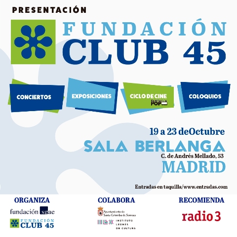 Y ya para cerrar, el sábado 23 de octubre a las 12:00 horas, tendrá lugar una conferencia para presentar oficialmente el proyecto del museo de la Era Pop y un photocall a cargo de la fotógrafa Mary Wilson. El broche musical de la muestra correrá a cargo de Zabriskie (con Juan Marigorta al frente; en concierto a partir de las 19:00 horas) y Los Modernos (trío en el que milita el que fuera bajista de Los Flechazos, Héctor Escobar; en directo a partir de las 20:00 horas.