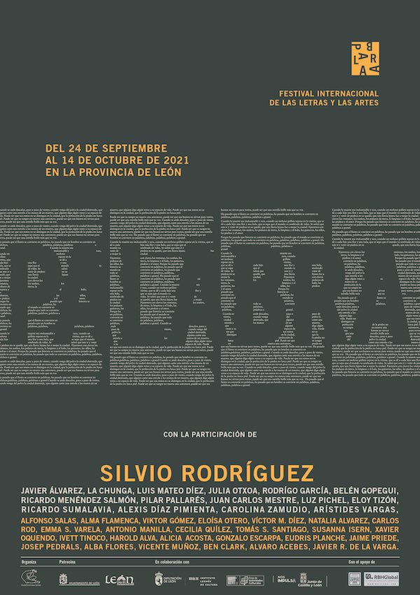 El ‘Festival PALABRA’ «nace para dar impulso a León como ciudad literaria», según sus promotores, y ofrecerá una veintena de actividades a lo largo de 17 jornadas, entre el 24 de septiembre y el 14 de octubre. El festival contempla la entrega del galardón literario ‘Leteo’, que celebra su décimo novena edición, y que en esta ocasión reconoce la trayectoria del al cantautor y poeta cubano Silvio Rodríguez.
