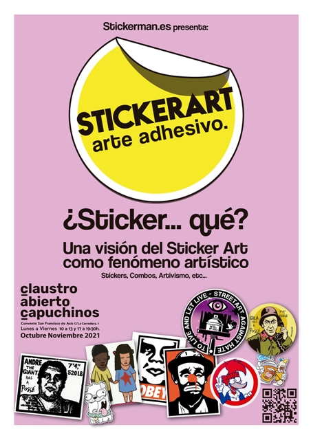 Las pegatinas adhesivas son el soporte principal empleado por los artistas del movimiento Sticker para trasladar el mensaje o la imagen que desean enviar a los habitantes de las ciudades. Mensajes positivos, guiños, complicidad o humor. Son como modernos mensajes en botellas a la deriva para naúfragos urbanos. Y como cualquier arte efímero, envía mensajes con la vocación de permanecer, pero con la resignación de saber que va a desaparecer con el tiempo, bien sea por las inclemencias del tiempo, o por los servicios de limpieza. En la exposición ¿Sticker… qué? se puede ver el combo más grande de España (colección de obras adhesivas de diferentes artistas en un mismo espacio), que se realizó en el Festival de Arte urbano Art Aero Rap (La Bañeza, León), pero también un homenaje a Sephard Fairey, considerado el “padre” del Sticker Art. Además la exposición reúne una amplia selección de piezas, tanto lienzos, como stickers de gran tamaño del artista leonés Stickerman y algunos otros ejemplos de artistas de todo el mundo, como el mencionado Sephard Fairey (Obey), Cheer UP, Dave Combs, Sophía Gasparian o el colectivo alemán No hate family. La exposición se puede visitar de lunes a viernes de 10:00 a 13:00 y de 17:00 a 18:30h hasta el 20 de Noviembre.Stickerman.es