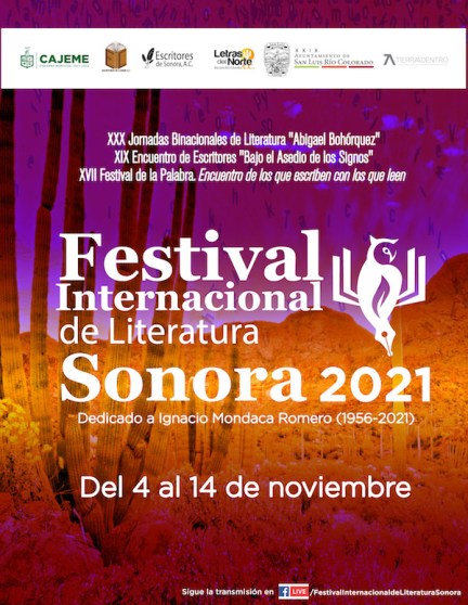 El FILSON 2021 ofrecerá al público lector de cualquier parte del mundo una nutrida selección de la literatura que se escribe actualmente en castellano. Por segundo año, Letras del Norte, Escritores de Sonora y Escritores de Cajeme organizan este festival desde México como una respuesta alternativa a la imposibilidad de efectuar los tradicionales encuentros presenciales de escritores que se realizaban anualmente. La edición de este año está dedicada a Ignacio Mondaca Romero, recién fallecido narrador y poeta sonorense.