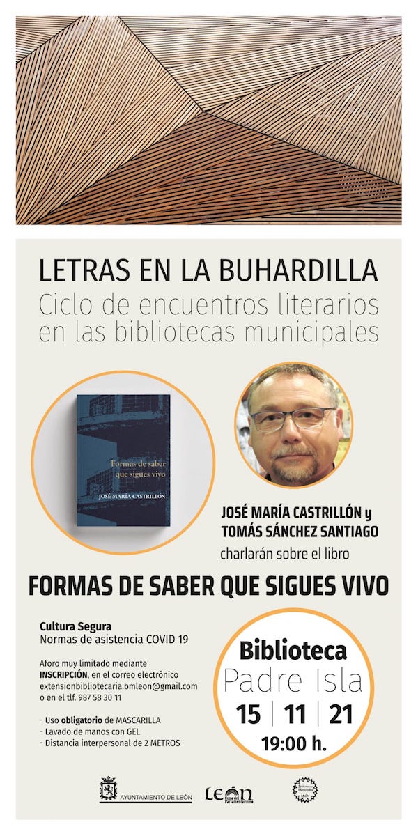Este lunes, 15 de noviembre, el poeta asturiano José Mª Castrillón estará en la biblioteca municipal Padre Isla (León) para presentar su antología de poemas Formas de saber que sigues vivo (Editorial la Garúa, Barcelona, 2021), acompañado por el escritor Tomás Sánchez Santiago, autor del prólogo del libro.