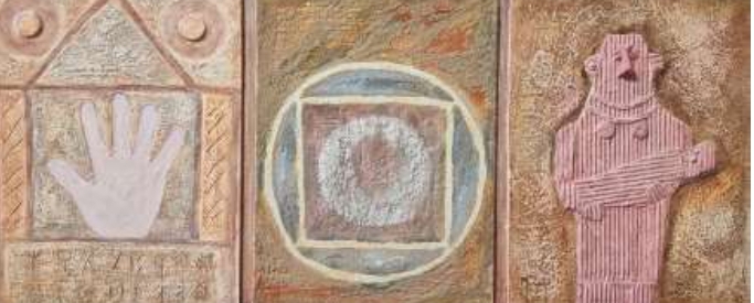 El recorrido por la pintura de Ángela Merayo lo abre la obra inspirada en la conocida ‘Estela de Tabuyo’, para concentrarse a continuación en la representación de una realidad existente: la de los signos asociados a la cultura megalítica que se desarrolló en la ampurdanesa sierra de La Albera, en la que el hombre prehistórico trazó caracteres que son imágenes del arte en su fase simbólica, o tal vez invocaciones. Atrapada por estos elementos altamente sensitivos, replica sus líneas y su enigmática simbología, los hace flotar sobre campos de materia coloreada – arenas, polvo de mármol – dotándoles de corporeidad y textura hasta parecer bajorrelieves. La obra de Merayo ha mostrado una persistente relación con la naturaleza, que aquí gravita en la organicidad del material empleado -las tierras- y está presente también en la iconografía que muestra el hermoso collage textil construido con elementos del paisaje -en su amplio sentido- de la Sobarriba.