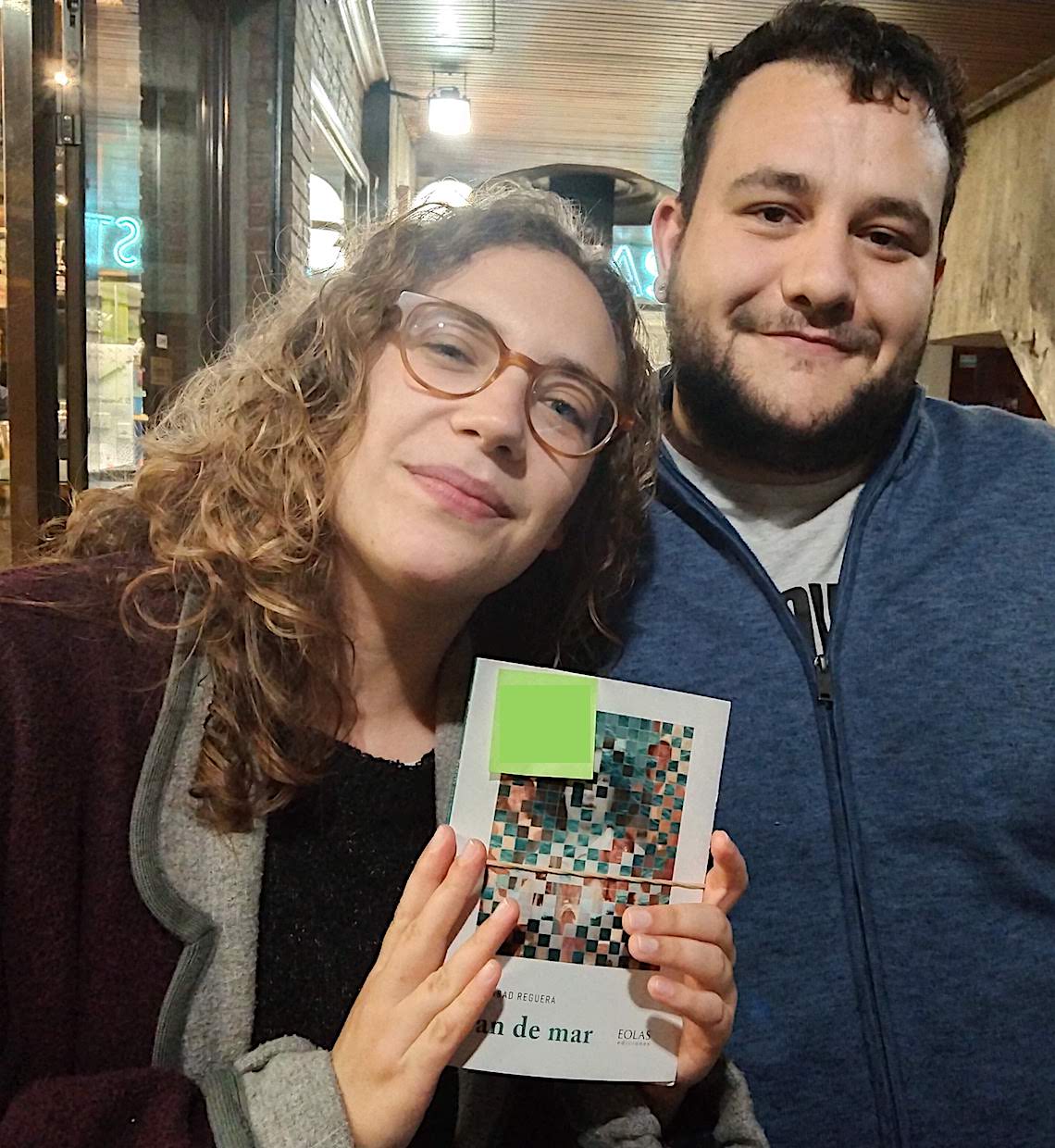Sara Abad Reguera y Álvaro López Serrano en una foto tomada hace unas semanas, cuando llegó la prueba de imprenta del libro "Pan de mar". Foto: Eloísa Otero.