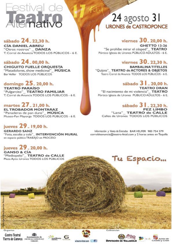 Y de la poesía del país que ama a Pessoa a las composiciones íntimas de los Títeres de María Parrato. “FETAL de Urones de Castroponce es para nosotros una joyita de los festivales por lo genuino y auténtico en nuestra Comunidad”, afirman María José Frías y Mauricio Zabaleta. Y lo justifican así: “Enmarcado en este pequeño pueblo de Tierra de Campos, el festival da valor al medio rural, a la belleza de esta manera de vivir, a las personas, a las formas, a los paisajes en los que se ubica y su innegable mérito al situar al arte en él”.