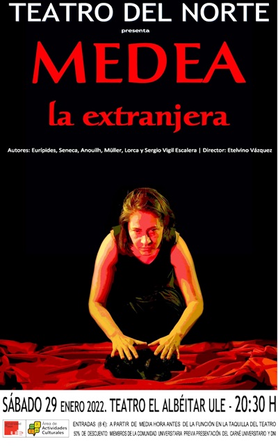 La compañía asturiana Teatro del Norte lleva a escena este sábado 29 de enero en el Teatro El Albéitar (León), la obra ‘Medea la extranjera’. Está dirigida por Etelvino Vázquez, que se ha ocupado de su dramaturgia a y también de la interpretación junto a Cristina Lorenzo y David González. El espectáculo que dará comienzo a las 20:30 horas, aborda temas como la emigración, la violencia de género o la xenofobia.