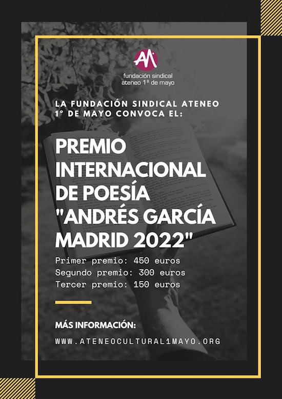 La Fundación Sindical Ateneo 1º de Mayo convoca el Premio Internacional de Poesía «Andrés García Madrid» 2022, dotado con 450 euros (hay dos premios más, de 300 € y 150 €, respectivamente) para un poema de tema libre. El plazo de admisión expira el 27 de marzo de 2022.