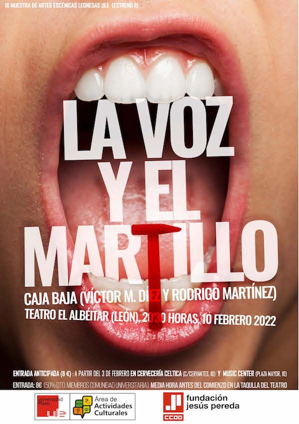 El dúo caja baja, integrado por el poeta Víctor M. Díez y el músico Rodrigo Martínez, pone en escena su pieza sobre el trabajo ‘La voz y el martillo’. Será en el Teatro El Albéitar (León), el próximo jueves 10 de febrero, a las 20:30 horas. El acto está coorganizado por la Fundación Jesús Pereda.