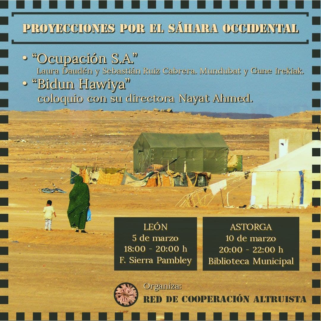 Se proyectarán “Ocupación S.A.” y “Bidun Hawiya”, de Nayat Ahmed Abdesalam sobre el Sáhara Occidental y la pérdida de identidad,, contando con la presencia de su directora: el 5 de marzo en la Fundación Sierra Pambley de León (18:00-20:00 horas.) y el jueves 10 de marzo en la Biblioteca de Astorga (20:00-21:30 horas.). En ambas citas habrá una presentación y un espacio abierto para compartir las experiencias y saberes de Nayat y de las personas que asistan.