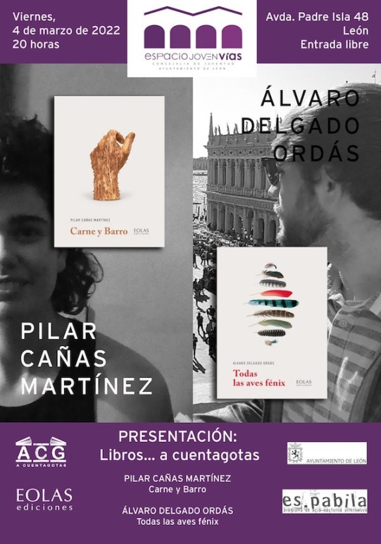 Este viernes 4 de marzo, a las ocho de la tarde en Espacio Vías (en la parte de arriba), se presentan los libros «Todas las aves fénix», de Álvaro Delgado Ordás, y «Carne y Barro», de Pilar Cañas Martínez. Los autores conversarán sobre sus libros, leerán algunos textos y poemas y, al final, Pilar Cañas cantará algunas canciones.