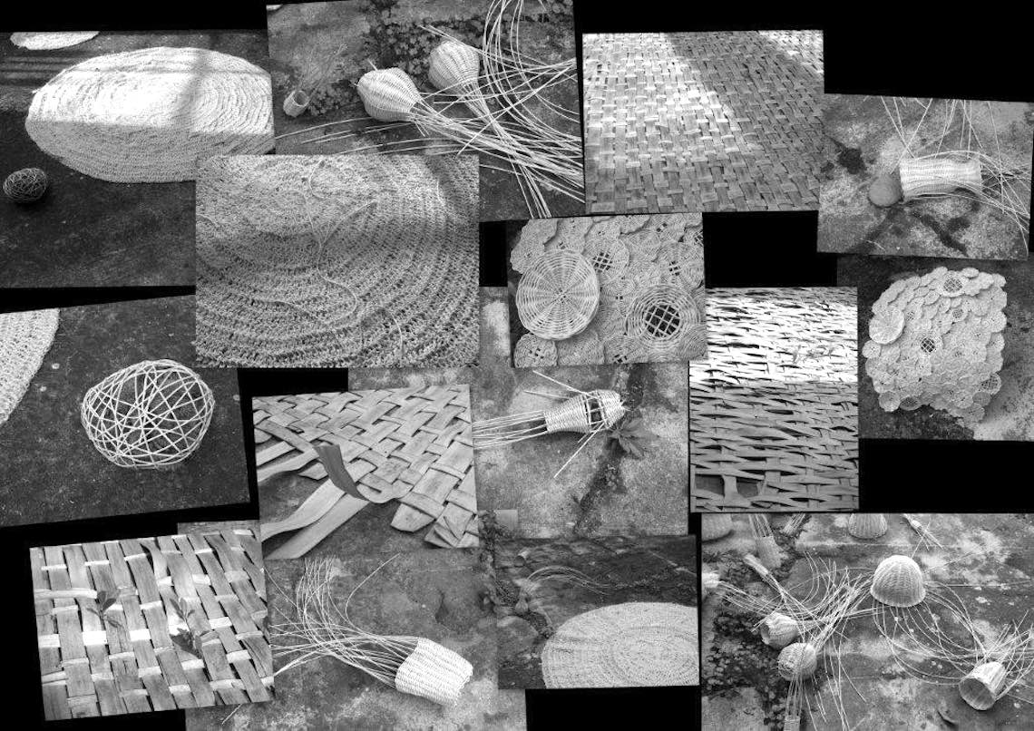 Con fibras vegetales (mimbre, bambú, yute) ha ido tejiendo alfombras, erizos, medusas, rosetones e ingenios biomórficos. Algunos de ellos vibran cuando los acaricia una leve corriente de aire, o se inquietan con las voces de los estudiantes que llegan desde las aulas; otros, en fin, no se sobrecogen y duermen en las deleitosas regiones de las ideas. Unos han recogido finas partículas de arena, otros, gotas del rocío de estas noches de invierno y niebla. Todos parecen meditar, han dejado atrás aquella vida, la de un mundo en que no eran sino naturaleza inerte antes de ser retorcidos, tejidos y transformados, nacidos para este paisaje de sensaciones.