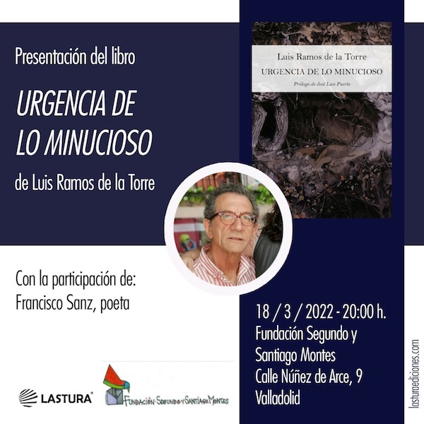 El poeta zamorano Luis Ramos de la Torre presentará su último libro, ‘Urgencia de lo minucioso’, en la Fundación Segundo y Santiago Montes (Valladolid), acompañado por el poeta Francisco Sanz. Será este viernes 18 de marzo de 2022, a las 20 horas. Entrada libre.
