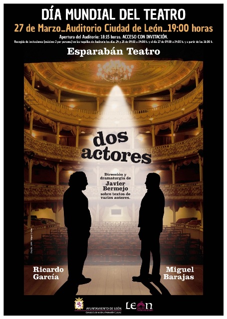 El próximo domingo 27 de marzo, Día Mundial del Teatro, el Auditorio de León acogerá a las 19:00 horas la puesta en escena de la obra “Dos Actores”, con dramaturgia de Javier Bermejo sobre textos de Sanchís Sinisterra, Lope de Vega, Luis Matilla y Francisco de Quevedo. Además, tendrá lugar la lectura de un manifiesto que este año ha escrito el estadounidense Peter Sellars, director de ópera, teatro y festivales. La entrada es gratuita con invitación.
