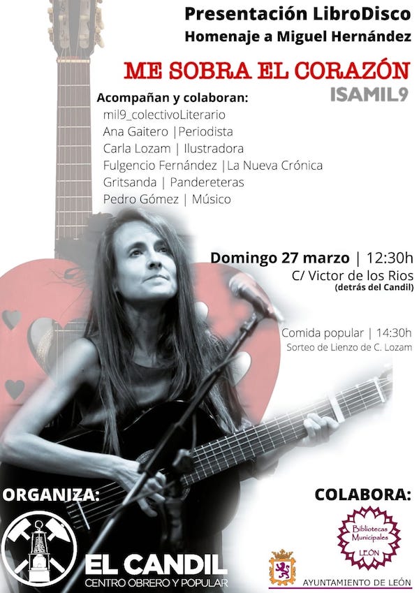 27 Marzo León 25 de marzo de 2022 Return to: Isamil9 recuerda los 80 años del asesinato de Miguel Hernández con el libro-disco ‘Me sobra el corazón’Máxima resolución (600 × 849) Image navigation Siguiente imagen