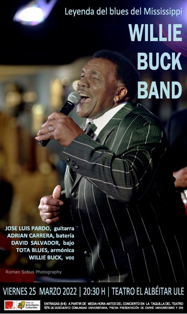 El Teatro El Albéitar (León) acoge este viernes 25 de marzo un concierto de Willie Buck Band, integrado por el cantante de Mississippi Willie Buck, leyenda viva del blues, José Luis Pardo (guitarra), Adrián Carrera (batería), David Salvador (bajo) y Tota Blues (armónica). Será a las 20:30 horas con entradas a 8 euros, 4 para los miembros de la comunidad, y se podrán adquirir en la taquilla del teatro a partir de las 20:00 horas.