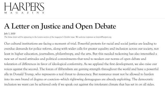 «Nuestras instituciones culturales se enfrentan a un momento decisivo. Las poderosas protestas por la justicia racial y social están dando lugar a demandas atrasadas de reforma policial, junto con llamamientos más amplios hacia una mayor igualdad e inclusión en nuestra sociedad, sobre todo en la educación superior, el periodismo, la filantropía y las artes. Pero este ajuste de cuentas necesario también ha intensificado un nuevo conjunto de actitudes morales y de compromisos políticos que tienden a debilitar nuestras normas de debate abierto y tolerancia de las diferencias en favor de la conformidad ideológica. Mientras aplaudimos el primer desarrollo, también alzamos nuestras voces contra el segundo. Las fuerzas del iliberalismo cobran fuerza en todo el mundo y tienen un poderoso aliado en Donald Trump, quien representa una verdadera amenaza para la democracia. Pero no se debe permitir que la resistencia se endurezca en su propio tipo de dogma o coerción, que los demagogos de derecha ya están explotando. La inclusión democrática que queremos solo se puede lograr si nos pronunciamos en contra del clima intolerante que se ha instalado en todos lados.
