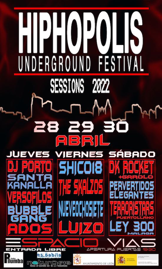 El festival de cultura urbana ‘Hiphópolis’ regresará a Espacio Vías (León), en su quinta edición, los días 28, 29 y 30 de abril, dentro de la programación de es.pabila. La entrada será gratuita hasta completar aforo y, aunque va dirigido a población joven, estará abierto a todos los públicos. Rap, Rap y Reggae, Ska, y Rap y Rock se darán cita desde las 19:30h a las 12:00h de la noche con grupos de León, Oviedo, Cuidad Real y Málaga.