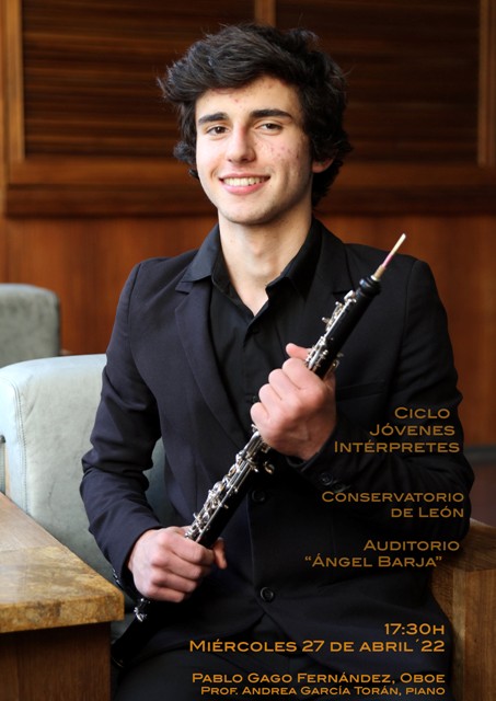 El miércoles 27 de abril también se ofrecen dos conciertos: a las 17:30 horas el oboísta Pablo Gago Fernández, acompañado por la profesora Andrea García Torán, interpretará obras de Hummel, Schumann y Lebrun.