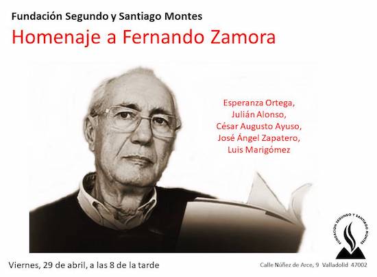 El viernes 29 de abril de 2022, a las 8 de la tarde, la Fundación Segundo y Santiago Montes acogerá en su sede de la vallisoletana calle Núñez de Arce un Homenaje a Fernando Zamora. Participarán los escritores Esperanza Ortega, Julián Alonso, César Augusto Ayuso, José Ángel Zapatero y Luis Marigómez.