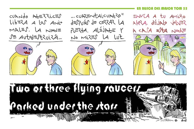 Tira 55 de “En busca del Major Tom”, del dibujante leonés Alberto D. Nogal. Una historieta gráfica de 28 páginas, ejecutada en técnica mixta con lápices de colores y ordenador, y concebida para la colección ArteBowie de Carlos Luxor. Cada semana publicamos una nueva tira, hasta 78 en total, de esta historia medio pop, medio naif, inspirada en el Major Tom, el personaje ficticio creado por David Bowie, en Space Odity, la mítica canción de 1969 en la que narra el viaje iniciático de este astronauta, rumbo a las estrellas.