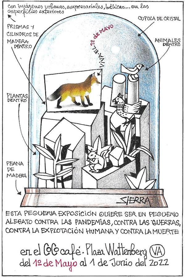 La exposición que este año Manuel Sierra ha dedicado al 1º de mayo no lleva título, simplemente es un grito con un largo subtítulo ciertamente explícito: “Pequeño alegato contra las pandemias, contra las guerras, contra la explotación humana y contra la muerte”. En esta ocasión, y van 14 años, siempre por estas fechas primaverales, el pintor de Babia vuelve a colgar sus demandas en el Coco-Café (Plaza de Federico Watemberg 1) de Valladolid.