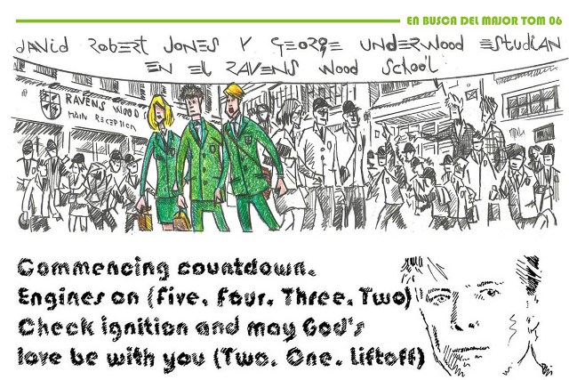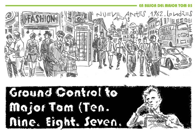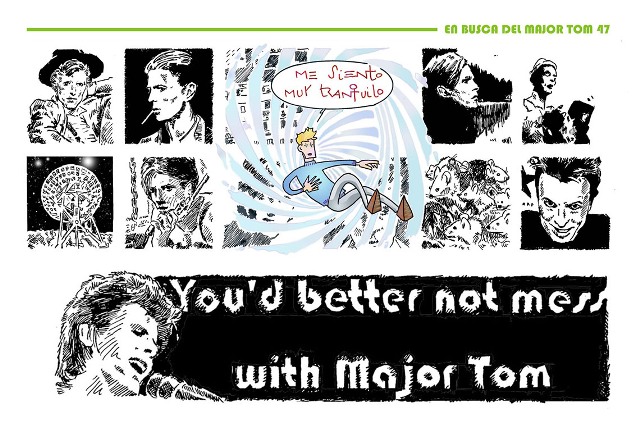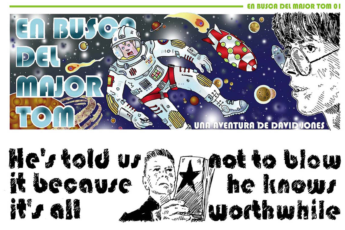 Sobre la elección del Major Tom el dibujante leonés asegura que le abre muchas posibilidades narrativas, más aún al tratarse de una creación del desparecido David Bowie, un personaje polifacético y poliédrico, posiblemente uno de los más interesantes de la cultura popular reciente, tanto en su proyección artística como en su vida personal. En esta historieta, Nogal relata una ficción centrada en un día de la vida de un David Bowie adolescente, todavía David Jones, que estudia en el instituto, dónde se explica la causa de la anasicoria que confirió a su aspecto una variable aún más enigmática. En el guión se insertan fragmentos de letras de sus canciones como Space Oddity, Ashes to Ashes, I Took a Trip on a Gemini Spacecraft . Canciones surrealistas y dalinianas, como las definió la crítica musical del momento.