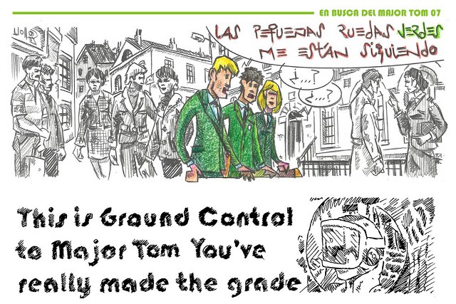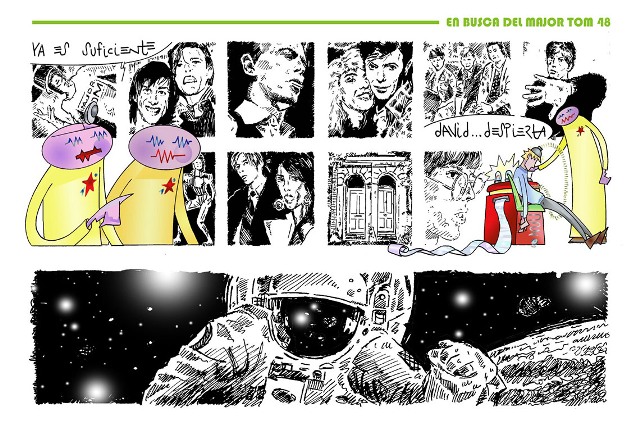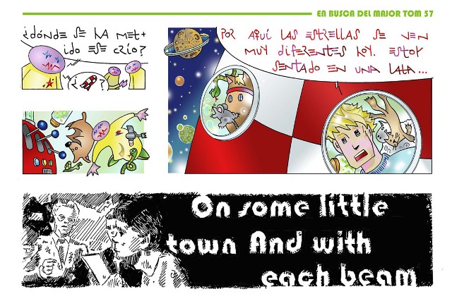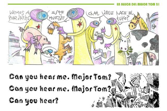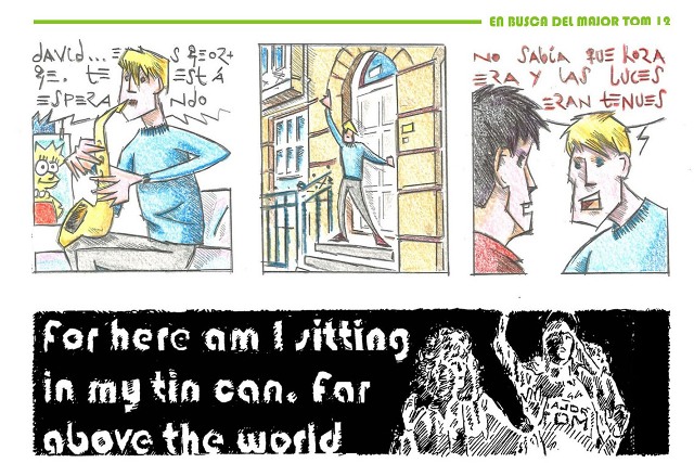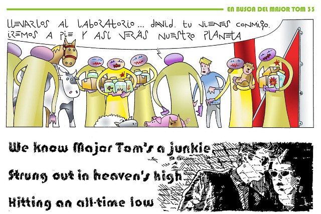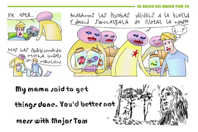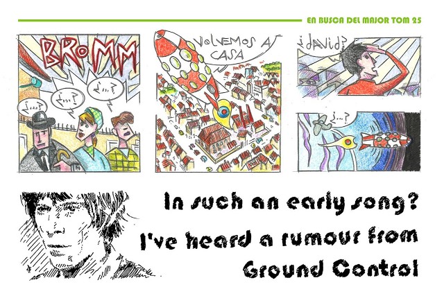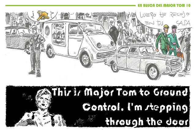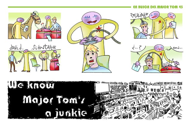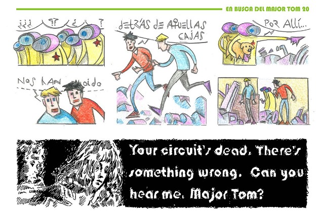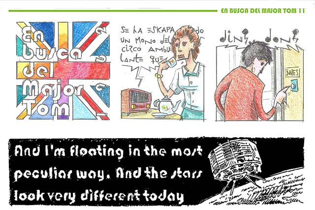 Tira 59 de “En busca del Major Tom”, del dibujante leonés Alberto D. Nogal. Una historieta gráfica de 28 páginas, ejecutada en técnica mixta con lápices de colores y ordenador, y concebida para la colección ArteBowie de Carlos Luxor. Cada semana publicamos una nueva tira, hasta 78 en total, de esta historia medio pop, medio naif, inspirada en el Major Tom, el personaje ficticio creado por David Bowie, en Space Odity, la mítica canción de 1969 en la que narra el viaje iniciático de este astronauta, rumbo a las estrellas.