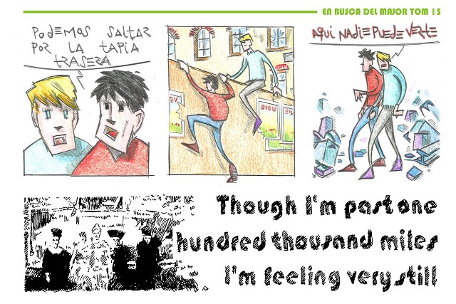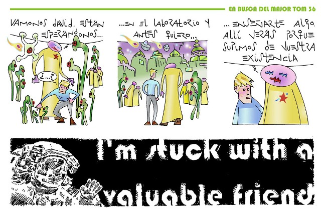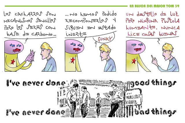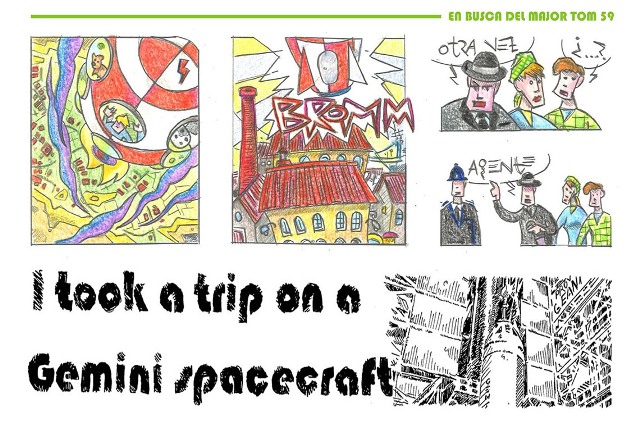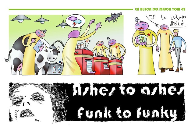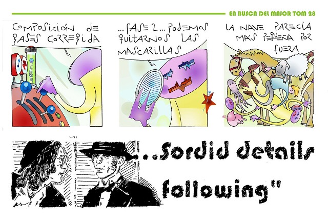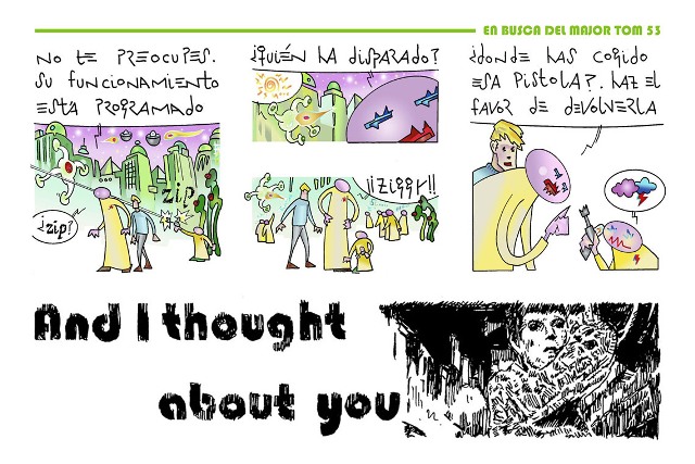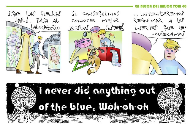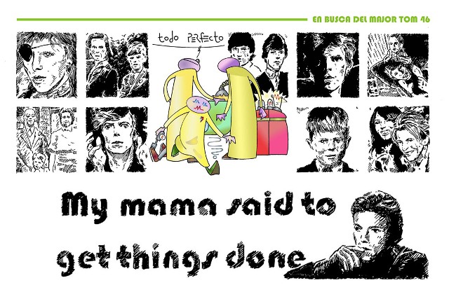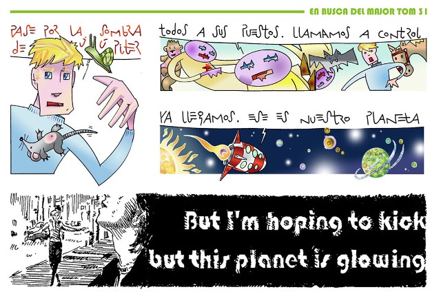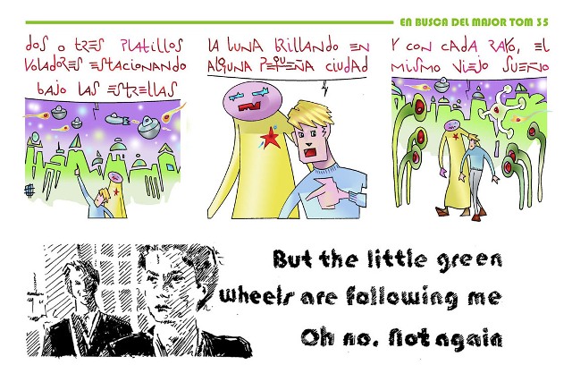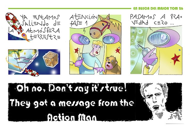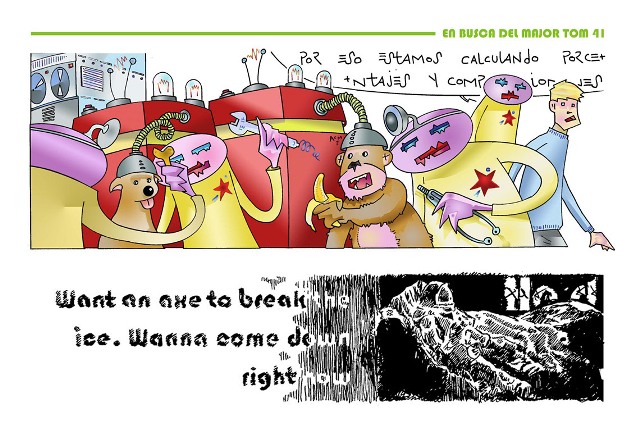 Tira 59 de “En busca del Major Tom”, del dibujante leonés Alberto D. Nogal. Una historieta gráfica de 28 páginas, ejecutada en técnica mixta con lápices de colores y ordenador, y concebida para la colección ArteBowie de Carlos Luxor. Cada semana publicamos una nueva tira, hasta 78 en total, de esta historia medio pop, medio naif, inspirada en el Major Tom, el personaje ficticio creado por David Bowie, en Space Odity, la mítica canción de 1969 en la que narra el viaje iniciático de este astronauta, rumbo a las estrellas.